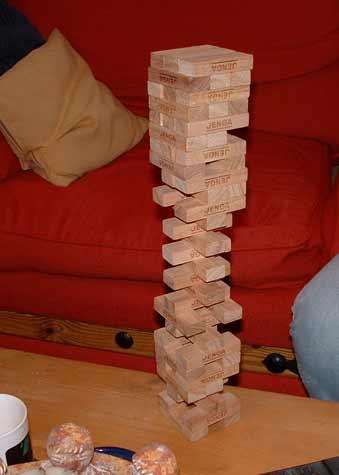 Le Jenga (sous-titré « La Tour Infernale ») est un jeu de société d'adresse et de réflexion dans lequel les joueurs retirent progressivement les pièces d'une tour pour les replacer à son sommet jusqu'à ce qu'elle finisse par perdre l'équilibre. Son nom vient du verbe swahili « kujenga », signifiant « construire » : « jenga! » en est l'impératif. Wikipedia